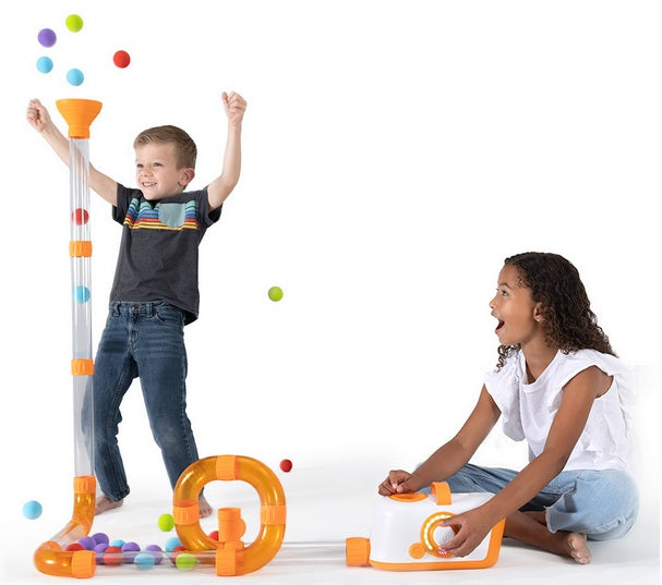 Kid-safe turbine that sends foam balls flying through a network of modular tubes Encourages spatial reasoning, creativity, experimentation, problem-solving, STEM learning Connect and arrange the tubes any way you want Accessories let you experiment with airflow and physics Fan unit features simple on/off button, large dial with LED indicators for adjusting airflow Experiment with how different levels of airflow affect movement Fan unit has a rubber carrying handle Rechargeable battery - 1 hour runtime on full speed, 3 hours on half speed Features auto shut-off after 15 minutes to prevent battery drain Includes 20 colorful EVA foam balls, 6 transparent 12-inch tubes, 6 transparent orange corner tubes, 1 T-tube, 1 silicone funnel, 12 easy-fit connectors, 1 fan unit, charging cable Packaged in a reusable storage/carrying case Plugs into a wall outlet to recharge - Recharges in under 2 hoursFan unit measures 11.5 x 6.5 x 6 inches High-quality materials and construction - Lasting durability, exceptional play experience
