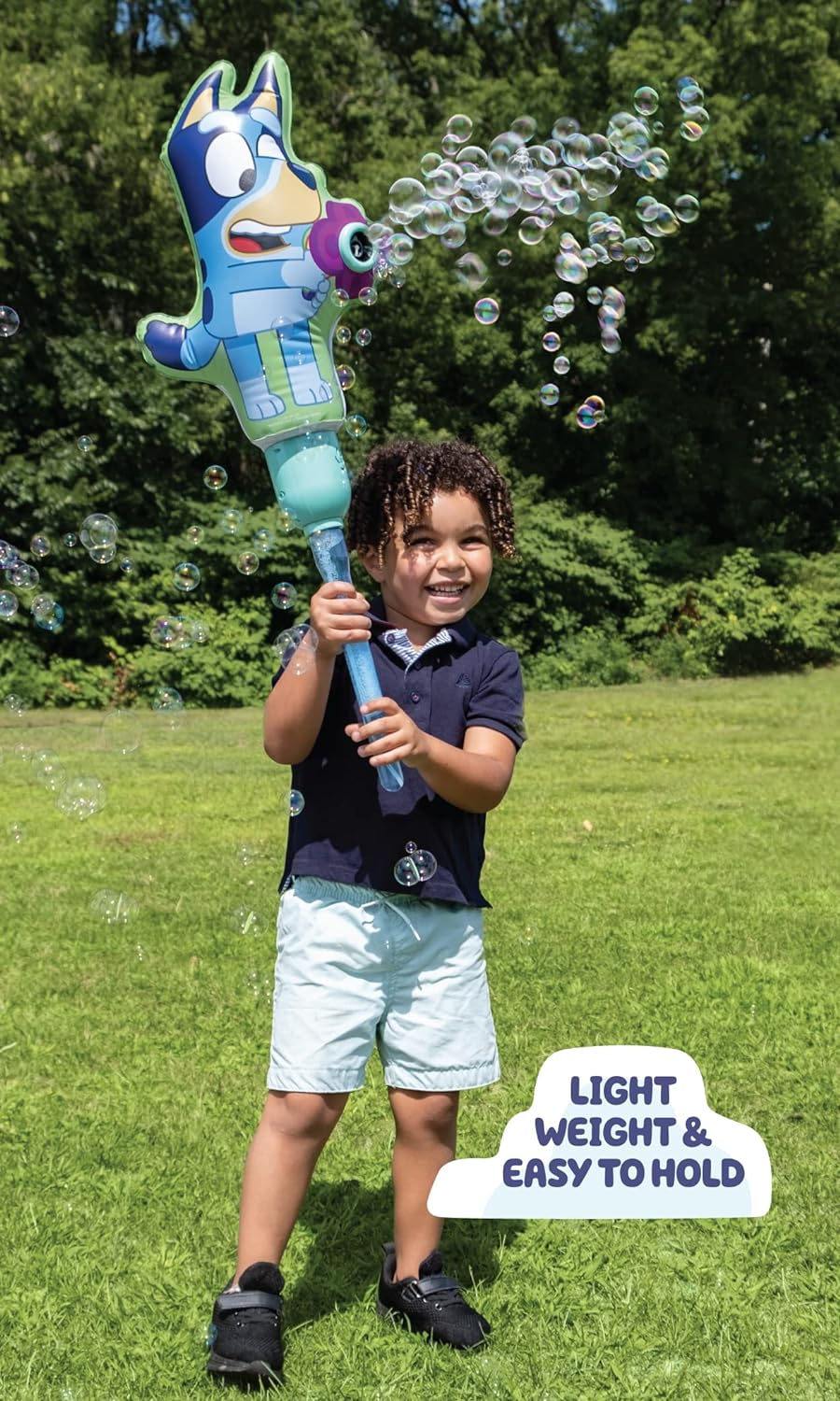 HUGE inflatable Bluey bubble machine that blows continuous streams of bubbles! Inflates to over 15? tall Includes 4.7 fl oz. of bubble solution Requires 3 AA batteries, not included Ages 3+