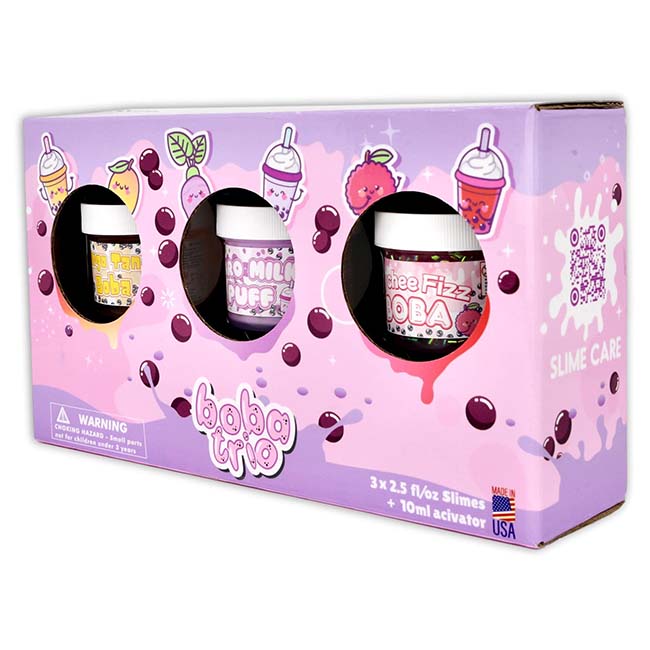Includes three boba tea-inspired slimes with unique scents and textures. Features fun and squishy boba beads for a satisfying sensory experience. Each slime represents a different flavor: taro, lychee, and strawberry. Great for stress relief, creative play, and fans of bubble tea-themed goodies. Best suited for ages 6+.