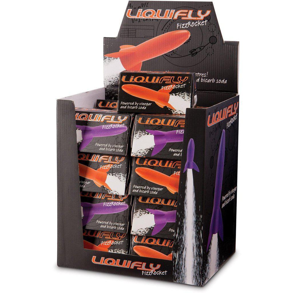 You can do all sorts of things with bicarbonate of soda (baking powder) and vinegar. For example clean a toilet (boring!), blow up a balloon (less boring!) or launch a rocket (let’s hear more about that!). How Can I Launch a Rocket with Baking Soda and Vinegar? The Liquifly Fizz Rocket Kit makes rocket launching simple with the addition of the aforementioned bicarb and vinegar which you can usually find lurking in a kitchen cupboard! The kit even includes a measuring scoop so you can precisely measure the amounts of each ingredient for maximum fizz! It’s quick and easy to assemble (just three parts) and can be used over and over to launch the rocket up to five metres in the air! The rocket uses the power of neutralisation! When you mix a base (bicarb) with an acid (vinegar) the two substances react to neutralise each other. In the process a weak acid (carbonic acid) and a harmless salt (sodium acetate) are briefly created and immediately break down into neutr Dimensions (of rocket): 8.5 (H) x 5.5 (W) cms Includes: rocket, double scoop and rocket stand Requires Bicarb of Soda and vinegar (not included) Adult supervision for children under 14 years Choking hazard: small parts, not intended as a toy for young children Do not use indoors.