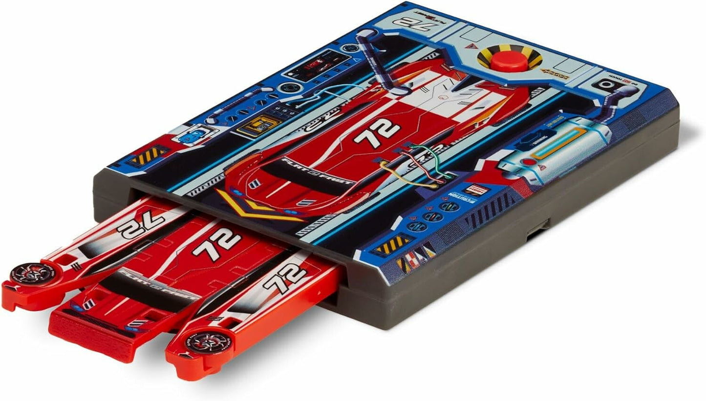 Ready, set, launch! Just press the button and watch new Flat2Fast Card Racers transform from cards into superfast racing cars! No pull back needed. Flat2Fast are portable and fit perfectly in a pocket or backpack for on the go play! Ages 5+