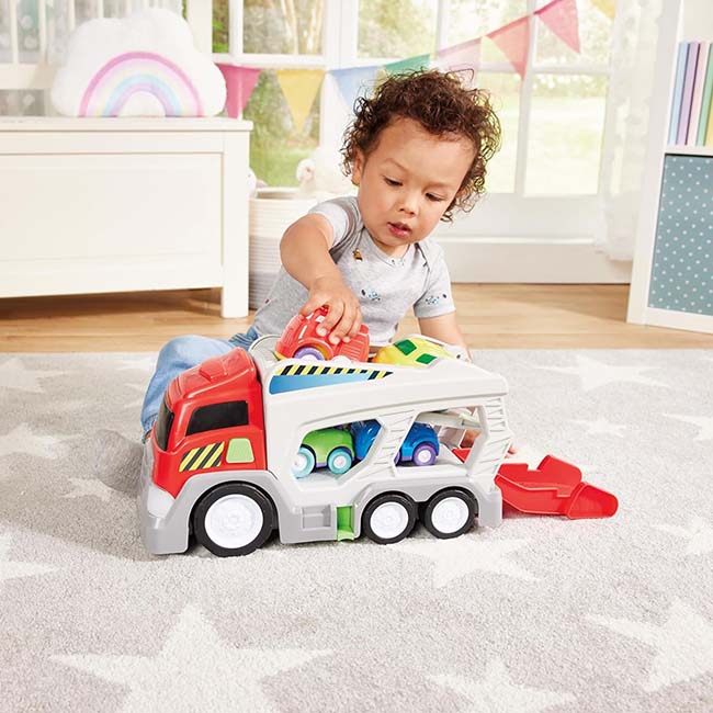Interactive double-decker car carrier with ramps for easy loading and unloading.. Press the green button to activate flashing headlights and realistic truck sounds. Includes four colorful, free-wheeling vehicles: fire engine, police car, mini bus, and racing car. Built-in handle for easy carrying and on-the-go play. Batteries included and ready for immediate fun. Best suited for ages 1.5 - 4 years