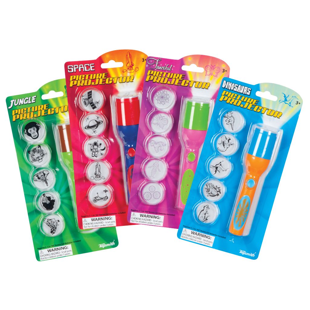 - The Mini LED Picture Projector is a fun handheld flashlight for kids with attachable image covers. Comes in 4 different themes and colors. Theme options include Jungle, Dinosaur, Space, and Fanciful. Each Mini LED Picture Projector toy includes 1 handheld, button-activated LED light and 4 detailed image covers. Image covers may include dinosaurs, butterfly, unicorn, mermaid, flowers, giraffes, elephants, astronauts, planets, and more.
