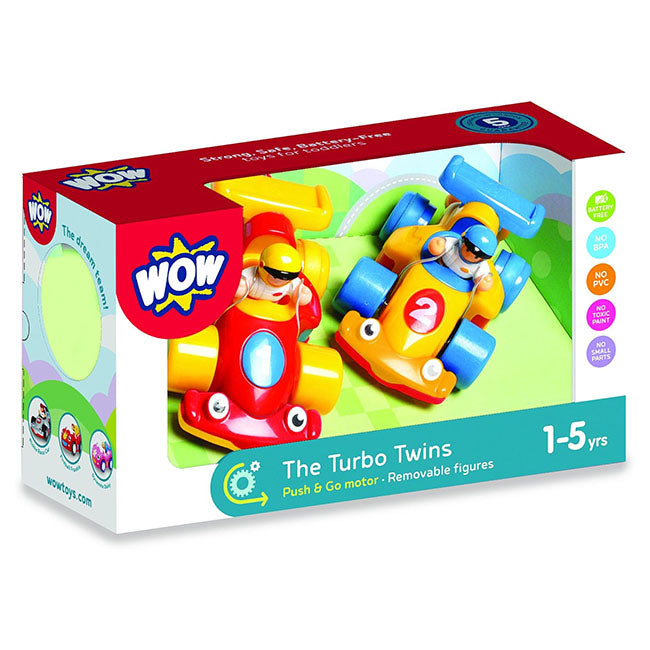 Set includes two colorful, friction-powered racing cars! Designed for little hands with no batteries required. Encourages cooperative play, motor skills, and racing fun. Features removable driver figures for added imaginative play! Durable, toddler-safe design! Recommended for toddlers 18 months and up.